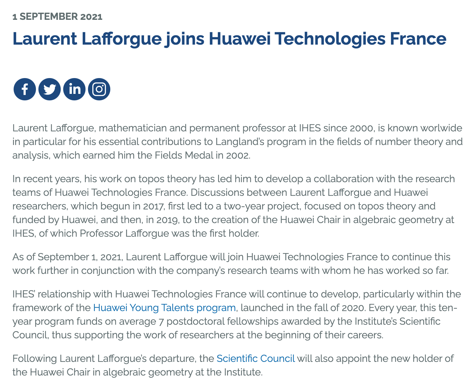 近日,从 IHES 的官网上可以看到,2002 年的 Fields Medal 得主 Laurent Lafforgue 加盟了法国华为,在公司将会继续从事 Topos Theory 方面的研究工作。数学家 Laurent Lafforgue 原来从事 Langland’s 纲领的研究,师从数学家 Gerard Laumon,师门另外有一个师弟 Ngo Bau Chau 也是 2010 年的 Fields Medal 得主,其研究方向是数论中的自守形式。从 Laurent Lafforgue 的个人简历来看,他在 1984 和 1985 年获得两枚 IMO 银牌。他 1986 年入读巴黎高等师范学院。在巴黎十一大学受 Gérard Laumon 指导完成博士论文之后,继续做出击研究员。2000 年担任发过高等科学研究所数学教授。2002 年获得菲尔兹奖,表彰他对数论和代数几何的贡献。2003 年,他成为法兰西科学院院士。下面是他当年拿到 Fields Medal 的评语。