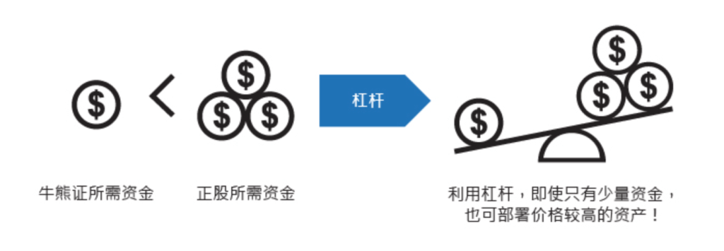 牛熊证跟期权一样,是带有杠杆的衍生产品,可以做到以小博大的效果。只需要用部分资金,就可以跟踪标的资产的表现。