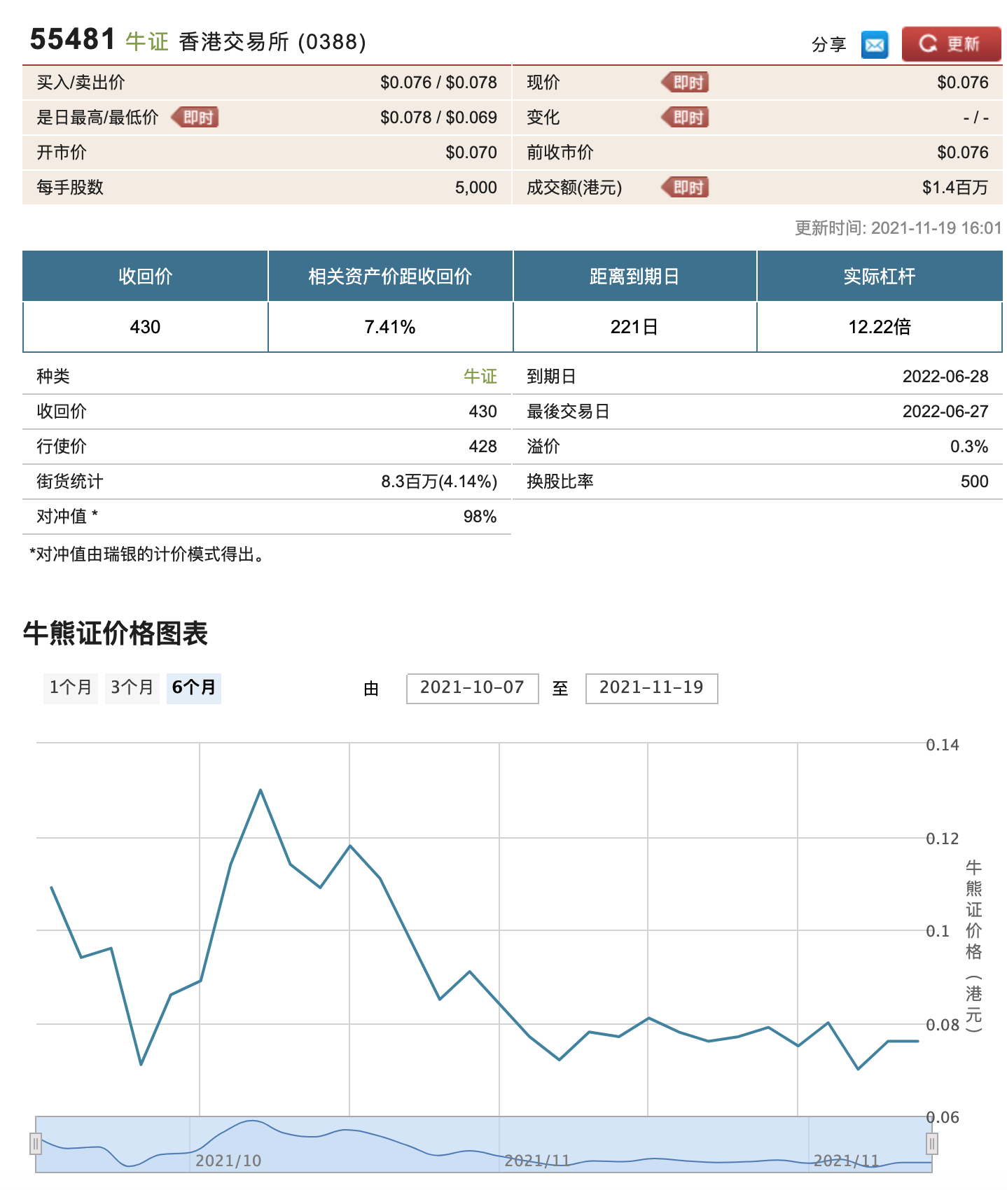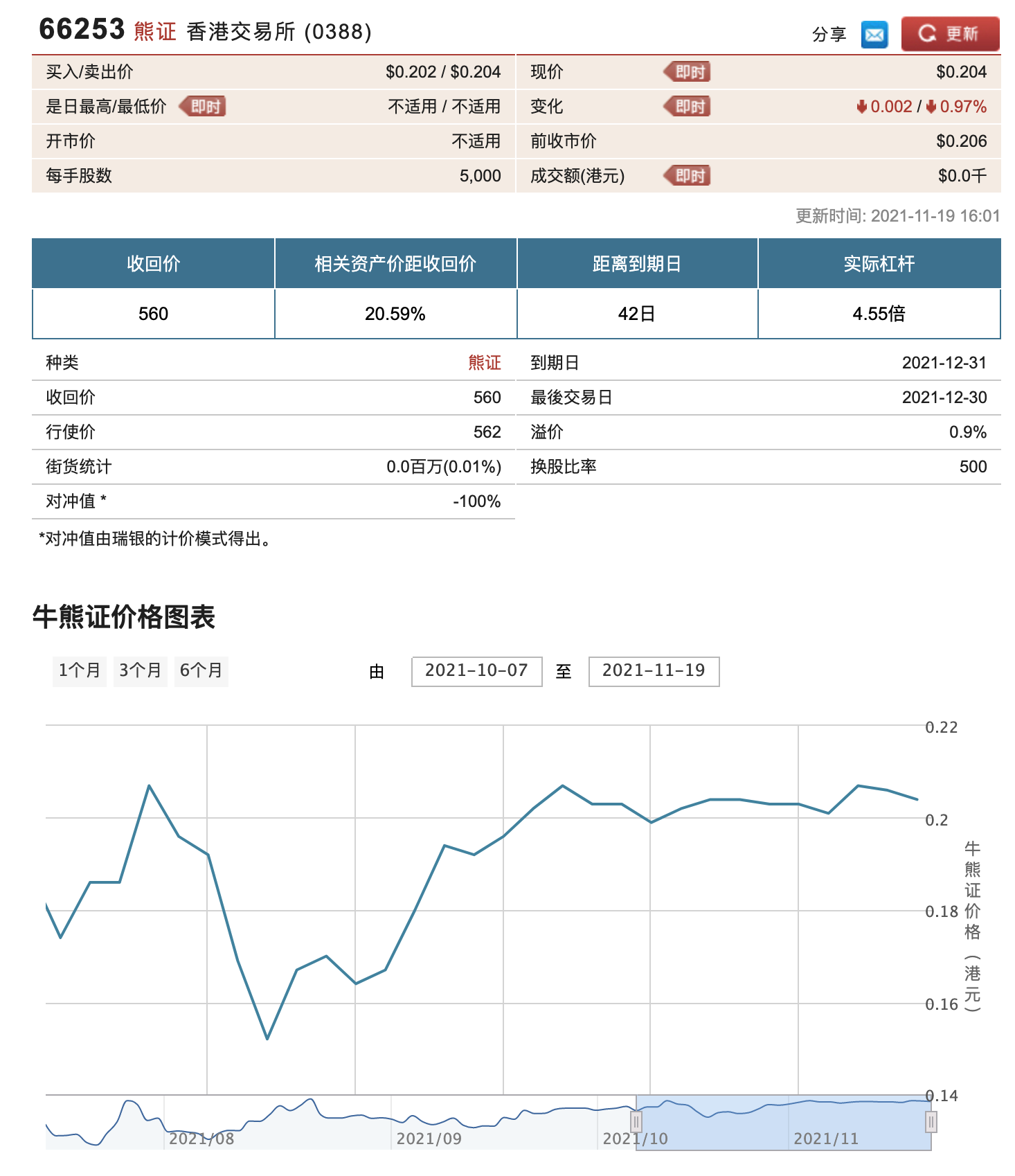 | 到期日 | 一旦牛熊证到期就会被收回,跟股票是不一样的。 |