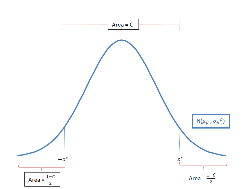 Prob\bigg(-z^{*}<\frac{\hat{p}-P}{\sqrt{\frac{\hat{p}(1-\hat{p})}{n}}}<z^{*}\bigg)=C,