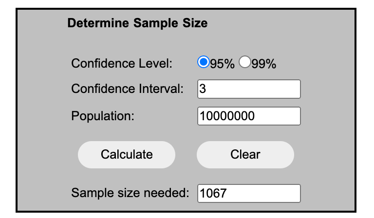 • 如果置信区间是 3\%, 置信度 C=95\% 的时候,最大样本数是:(1.38590 / (\sqrt{2} * 0.03))^2=1067;