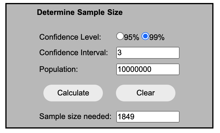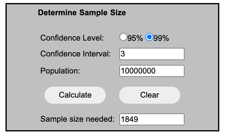 • 如果置信区间是 3\%, 置信度 C=99\% 的时候,最大样本数是:(1.82139 / (\sqrt{2} * 0.03))^2=1843;