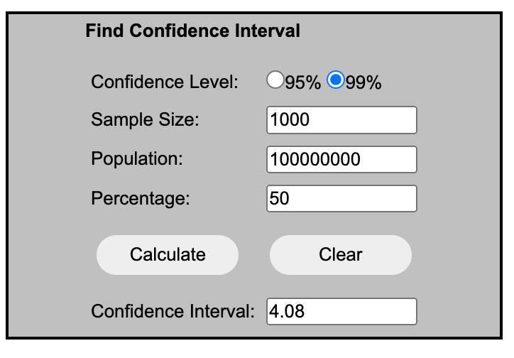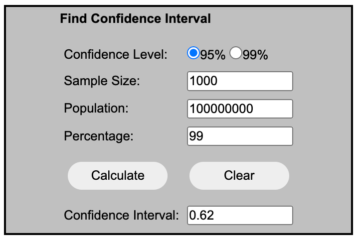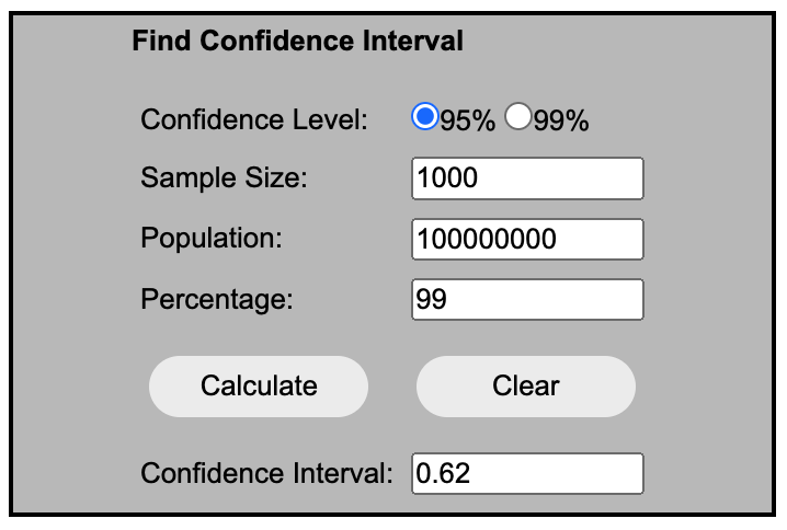 例如,如果置信度是 95%,置信区间(confidence interval)= 4,在样本中有 47% 的比例选择了某个选项,那么就表示 95% 的置信度,在所有数据中有(47%-4%, 47%+4%)=(43%,51%) 的比例选择了某个选项。95% 置信度表示这句话正确的概率是 95%,99% 置信度表示这句话正确的概率是 99%。