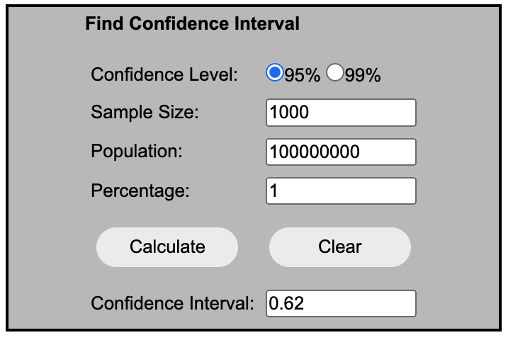• 如果置信度是 C=99\%, \hat{p}=50\%, n=1000, 置信区间是 \sqrt{2} * 1.82139* \sqrt{0.5 * 0.5 /1000}=0.0407=4.1\%.
