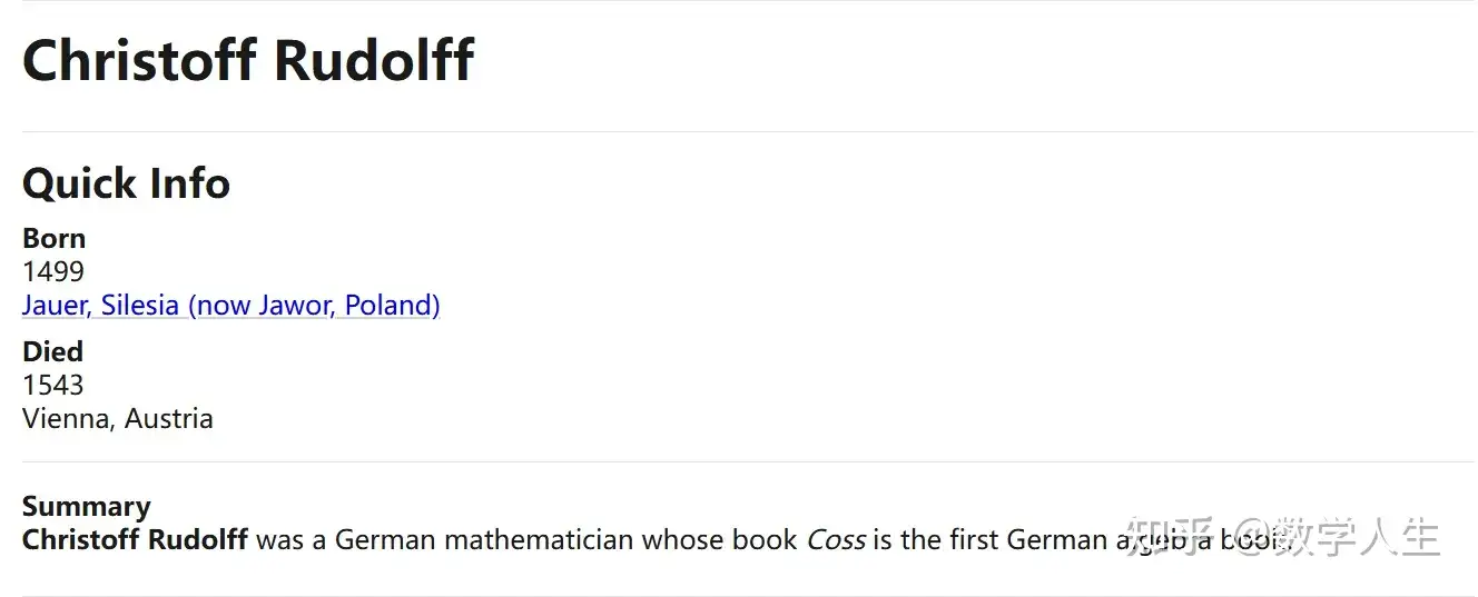 16世纪的克里斯托夫·鲁道夫(Christoph Rudolf,1499–1545) 在代数学领域有所建树。他的代表作《代数术》(Coss)系统介绍了代数符号和方程求解方法,推动了德国代数学的普及。书中首次使用根号符号(√)表示平方根,这一符号后来被广泛采纳并沿用至今。同时,米夏埃尔·斯蒂费尔(Michael Stifel,1487–1567) 进一步发展了代数和数论。他在《整数算术》(Arithmetica integra)中研究了二项式系数、算术序列及无理数理论,并尝试用几何方法证明代数命题,为符号代数的形成奠定了基础。斯蒂费尔还曾与马丁·路德合作,将数学思想应用于宗教改革时期的文献研究。