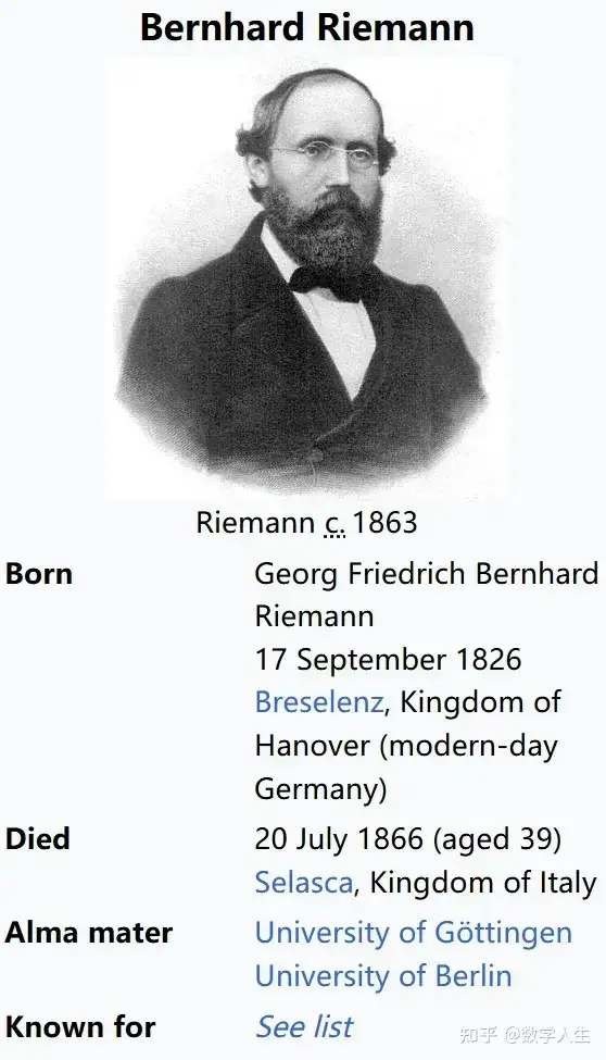 伯恩哈德·黎曼(Bernhard Riemann,1826-1866 以其对几何和分析的贡献闻名。他引入了黎曼几何,通过黎曼曲面的概念复分析推向新高度,并提出了黎曼积分和黎曼猜想,后者至今仍是数论中未解决的核心问题。他的工作为爱因斯坦的广义相对论提供了数学工具。他的工作在数学和物理学多个领域产生了深远的影响。黎曼出生于汉诺威王国的一个贫困牧师家庭,早年显示出非凡的数学天赋,在哥廷根大学和柏林大学学习期间受到高斯、狄利克雷等数学巨匠的指导。他的学术生涯虽短暂,却奠定了现代数学中多个重要分支的基础。