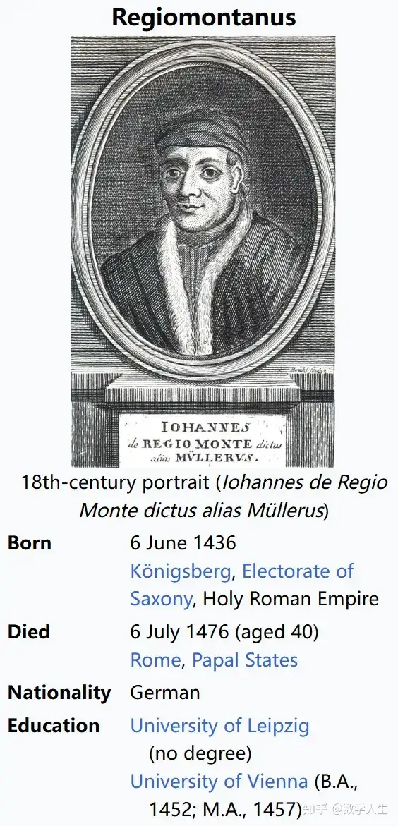 17世纪以前的德国数学发展虽不如同时期的意大利或法国那样耀眼,但仍有一批重要数学家为欧洲数学的复兴与传播做出了贡献。其中,雷格蒙塔努斯(Regiomontanus,1436–1476) 是文艺复兴时期的关键人物。他本名约翰内斯·米勒(Johannes Müller),因出生于柯尼斯堡(Königsberg)而取拉丁化别名“雷格蒙塔努斯”。他系统翻译并注释了希腊数学著作,尤其是托勒密的《天球论》和阿波罗尼奥斯的《圆锥曲线论》,推动了三角学的独立发展。他撰写的《论各种三角形》(De triangulis omnimodis)是欧洲第一部系统的三角学专著,首次明确将三角学作为独立学科而非天文学附庸,并改进了正弦表的计算精度,为后世导航和天文计算提供了基础工具。