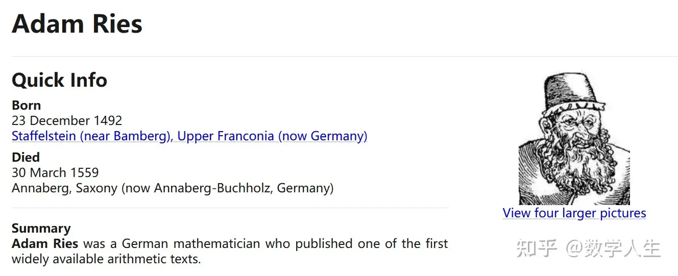 亚当·里斯(Adam Riese,1492–1559) 虽非理论数学家,却以实用算术教育影响了德国数学普及。他编写的算术教科书《计算艺术》(Rechenkunst)推广了印度-阿拉伯数字计算法,取代了传统的算盘计算,成为商人和学生的重要工具书,被誉为“德国计算大师”。这一时期德国数学的特点是从实用算术向理论学科过渡,并为17世纪莱布尼茨等人的重大突破奠定了基础。