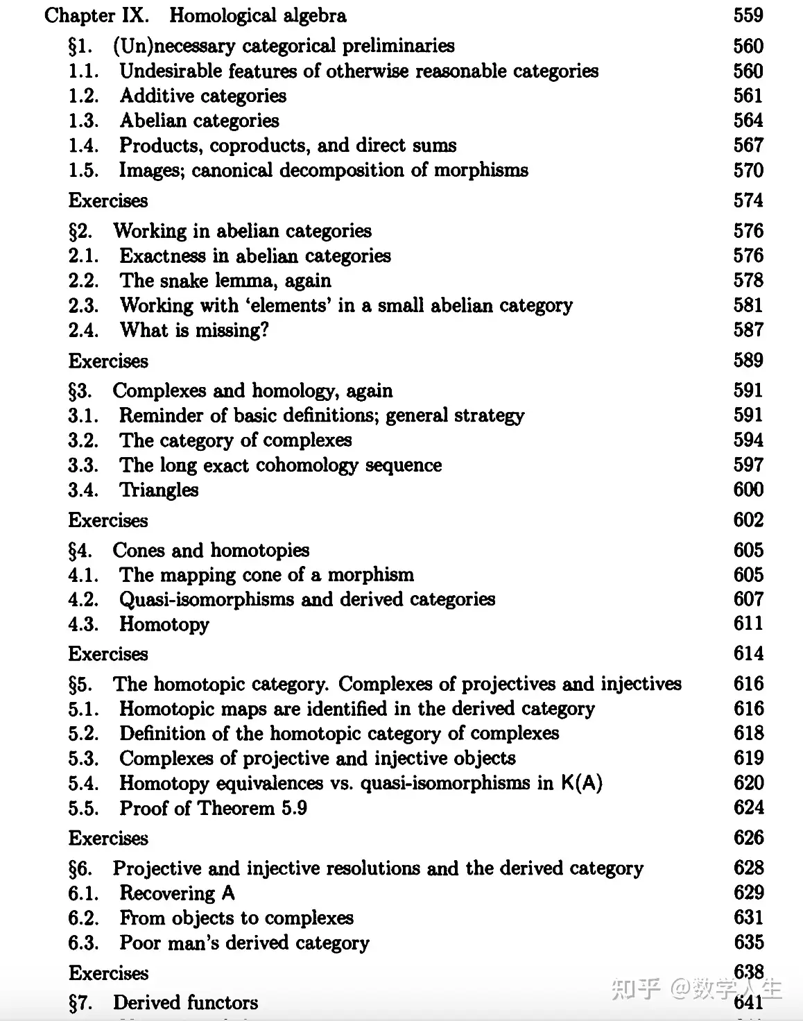 4. 历史与动机结合:在引入新概念时,作者常辅以历史背景或直观动机。例如,同调代数的章节始于拓扑中的链复形类比,帮助读者理解代数与几何的联系。