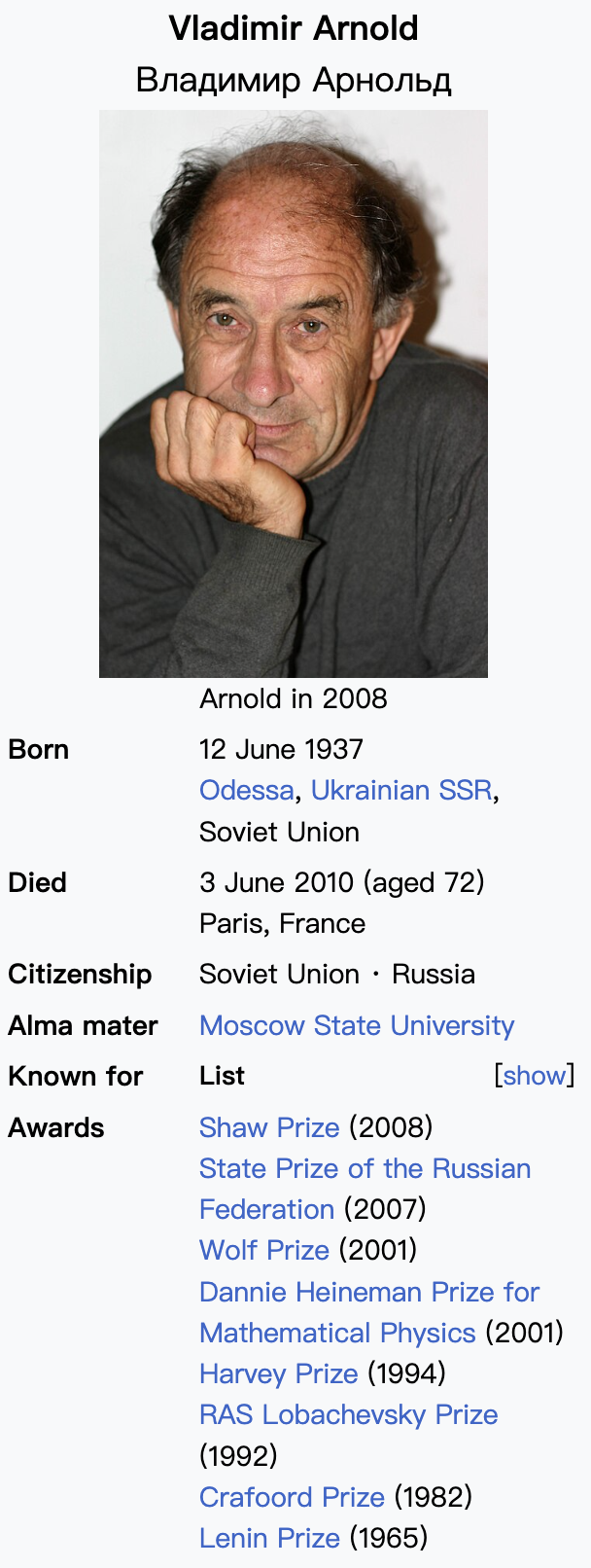 V. I. Arnold(弗拉基米尔·阿诺尔德) 阿诺尔德将柯尔莫哥洛夫与庞加莱、高斯、欧拉和牛顿并列,称“仅需五代人(柯尔莫哥洛夫-庞加莱-高斯-欧拉-牛顿)就能将我们与科学的源头连接起来”。他还提到柯尔莫哥洛夫对莫斯科大学数学系的深远影响,称其与佩特罗夫斯基共同塑造了该系的黄金时代(《A few words on Andrei Nikolaevich Kolmogorov》)。