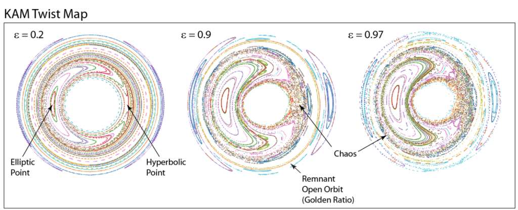 后来,我听说 Thurston 通过画图证明给 Jack Milnor 看:任意单峰映射的动力系统模式都会出现在取适当值c时对应的二次函数 x → x2+c 的迭代中。我因为正在学习动力系统,所以就计划花一个学期的时间在普林斯顿,向 Bill 学习这篇从刚才提到的画图而发展出来的关于 Milnor-Thurston 万有性的著名论文。