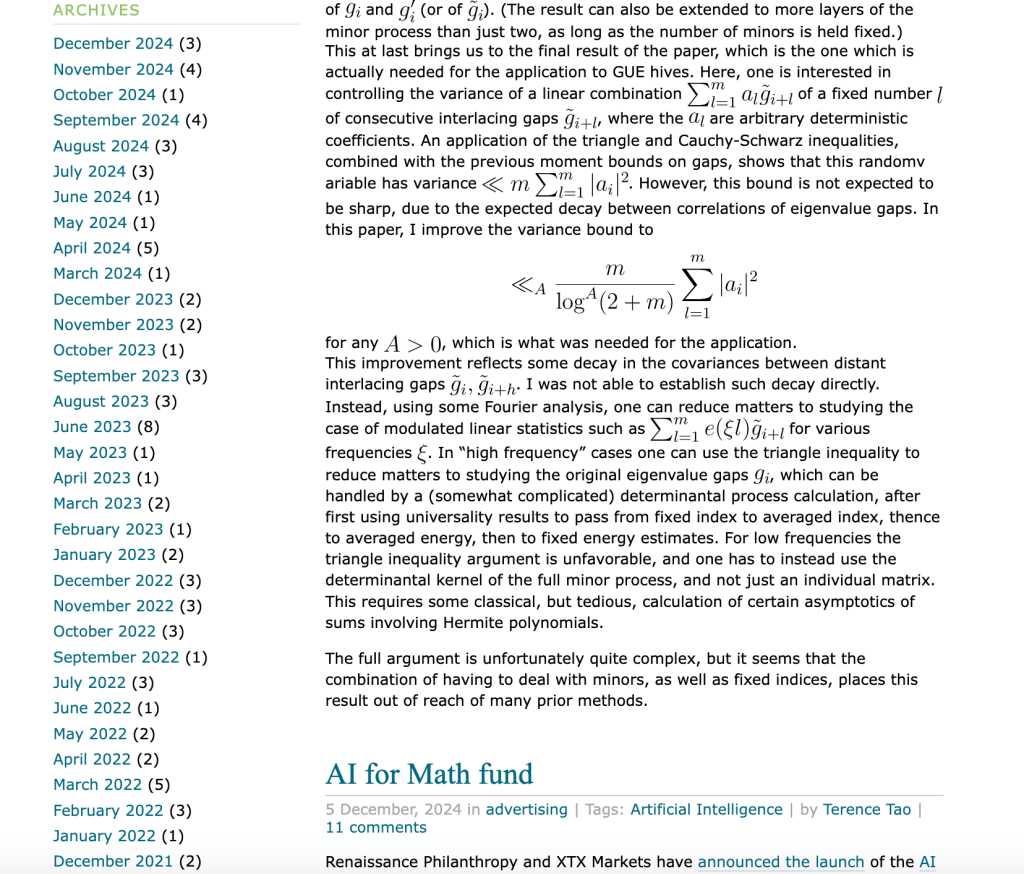 在 2025 年的第一个工作日,我偶然打开了陶哲轩的博客(What’s new),发现陶哲轩的博客至今依然在保持着极高的活跃度,平均每个月都有两三篇博客,在高峰时期甚至有一个月 8 篇的数量。在许多年前,我还在热衷于写各种技术博客的时候,就曾经在微信朋友圈感慨过陶哲轩在数学博客上面的这种持续耕耘的精神,没想到 5、6 年过去了,这个博客账号依然在更新和迭代。