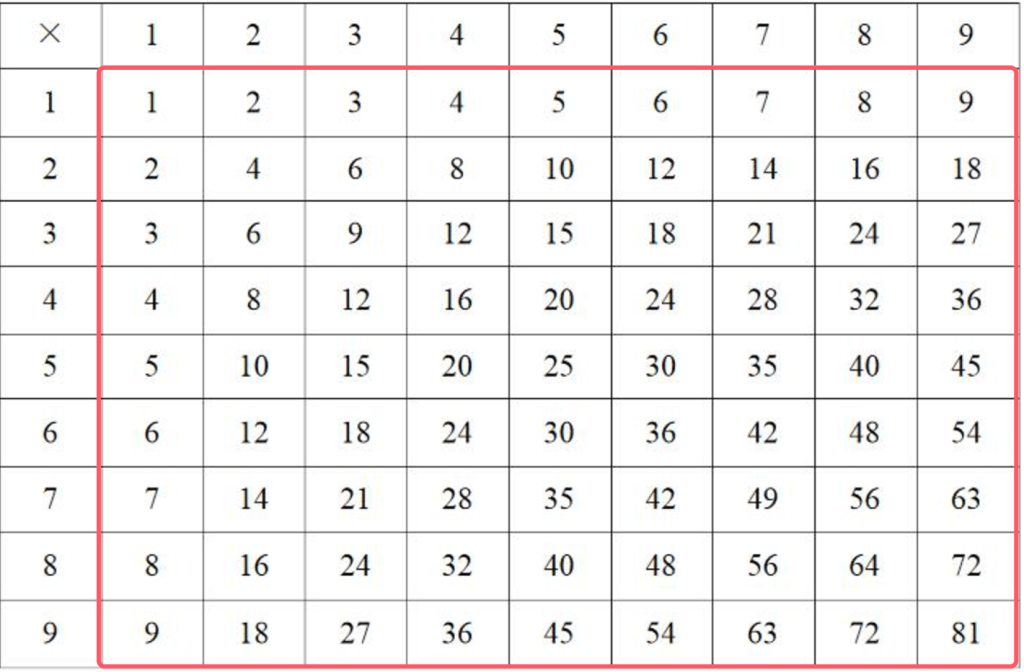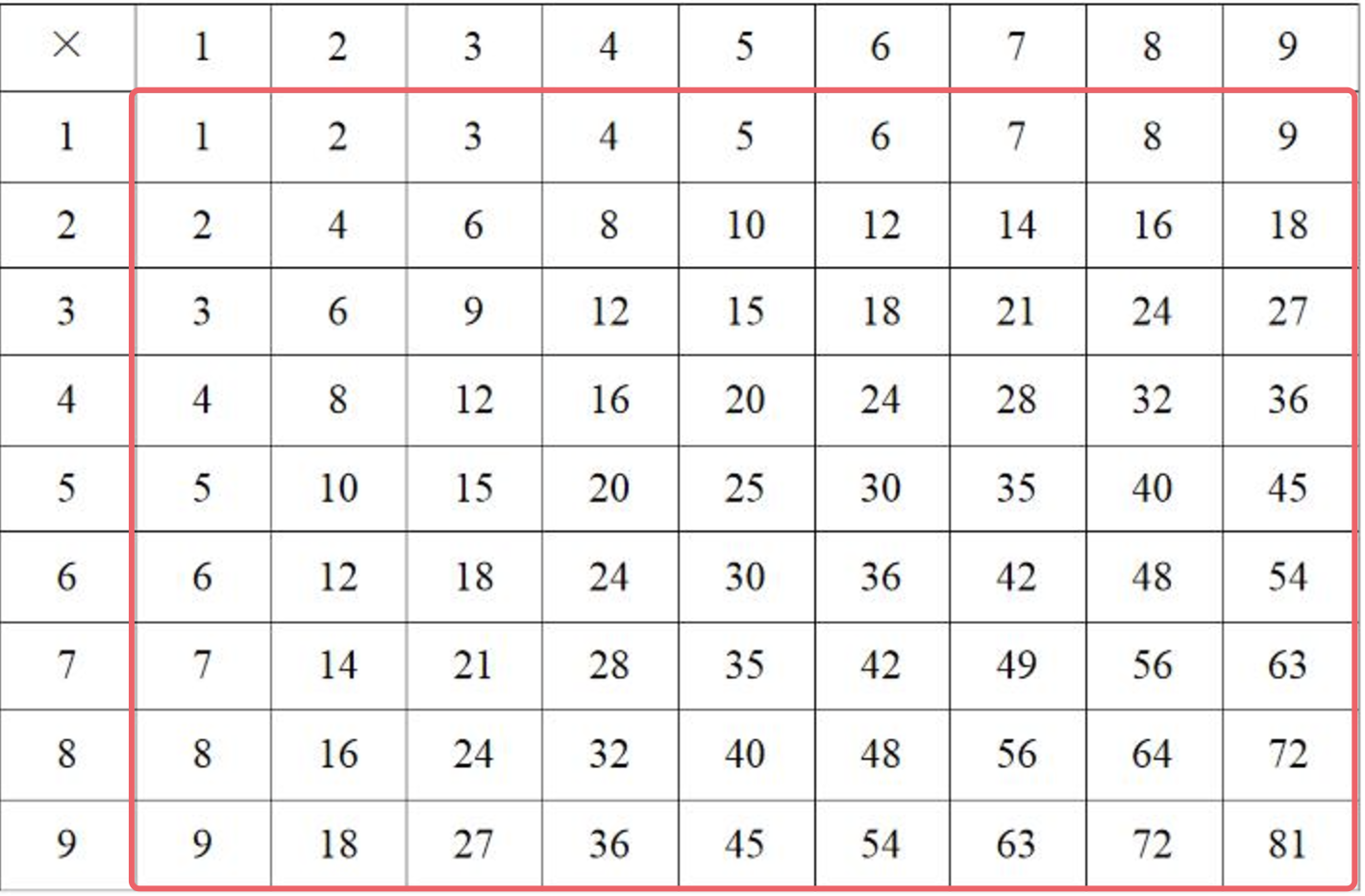 九九乘法表是大家都非常熟悉的表格,当我们把表格中红框的所有数字求和之后,我们会发现它的和恰好就是 2025。因为,