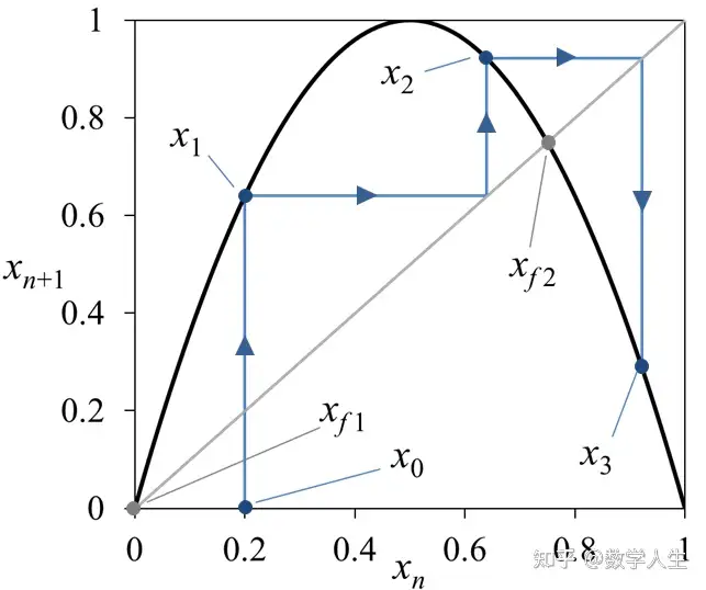 4. “剧情”: 点运动的轨迹 x₀, x₁ = f(x₀), x₂ = f(x₁) = f(f(x₀)), x₃ = f(f(f(x₀))), ...。这个序列 {x₀, x₁, x₂, ...} 称为轨道。